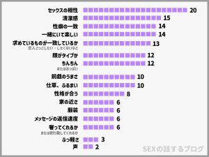 「セックスの相性」もしくは「一緒にいて楽しい」のどちらかは、ほぼどの方の回答にも入っていて、さらに優先順位が高かった印象があります。